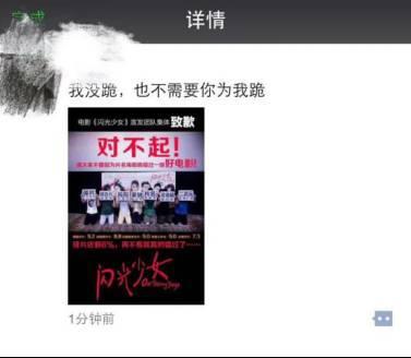 回归到《闪光少女》事件,正如某知名影评人所言,“没人会否认在群魔乱舞的国产青春片里,《闪光少女》算得上是良心制作。但这部电影并没有完美到无懈可击,更经不起这样的过度营销。如果说去年方励的下跪更多会让人感到心酸,这次《闪光少女》宣发团队的下跪就让人有些尴尬了。”
