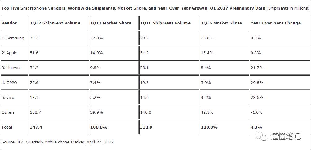 或许,就算是称霸手机市场多年的三星,也因为中国手机厂商的不断追赶而感到脊背发凉。就像IDC发布的2017年Q1全球手机市场的状况:三星的市场份额同比下降1%,而华为的同比增长达到了21.7%,OPPO、vivo的增幅也超过了20%。由此可见,三星的手机业务也在遭遇较大的竞争压力。