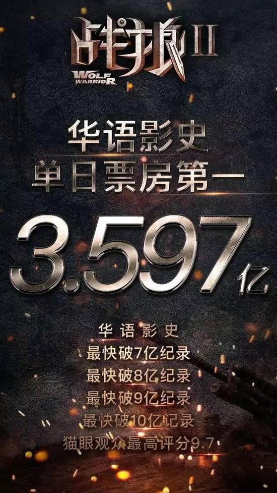 吴京执导的电影《战狼2》于7月27日晚上20点在全国院线登陆上映,仅耗时85个小时其票房就已突破10亿人民币。超越周星驰执导《美人鱼》92小时破10亿的速度,创造了华语影史的新纪录。与此同时,其首周末票房报收1.26亿美元让其成为全球周末票房冠军。