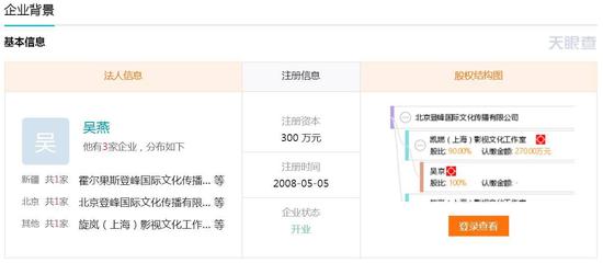 据天眼查数据显示,登峰国际目前的法人代表是吴燕,但在公司的股东信息中,上海凯燃影视文化工作室出资比例达到了90%,而上海凯燃影视文化工作室正是吴京的公司。与此同时,登峰国际的法定代表人在2016年1月20日有过一次变更记录,由吴京变更为吴燕。《战狼2》的6大出品方之一霍尔果斯登峰国际则是北京登峰国际的全资子公司。