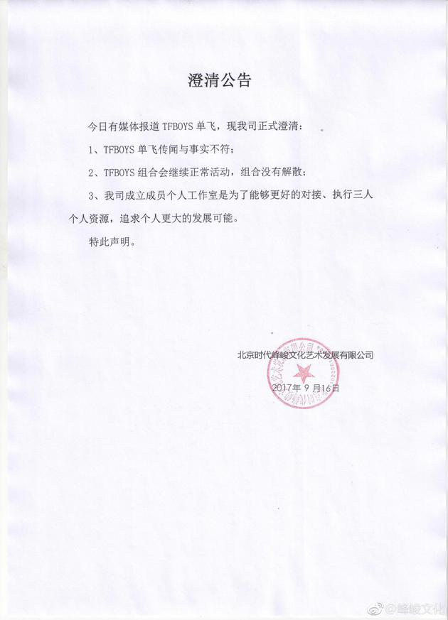 今天一早,TFboys三人各自成立工作室的消息就扑面而来,才刚刚过完四周年,TFboys就要解散了吗?下午经纪公司发出声明,单飞传言与事实不符,组合没有解散,成立个人工作室是为了追求个人最大的发展可能。