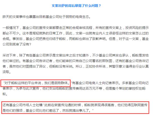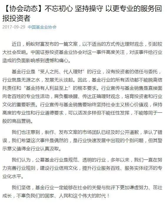 根据9月29日,微信公众号:中国基金报的消息,这起事件,已经引发了证监会的关注,同时基金协会也进行了回应(可参考:《“蚂蚁财富文案”事件引发监管关注:证监局紧急发问询函,基金业协会发文表态》一文)。