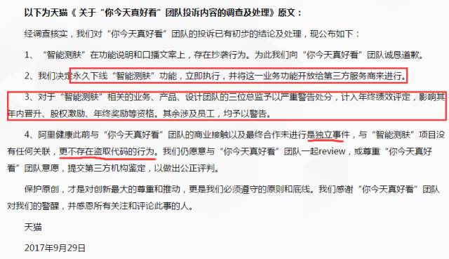 一、阿里旗下公司对涉“智能测肤抄袭门”人员作出处罚
