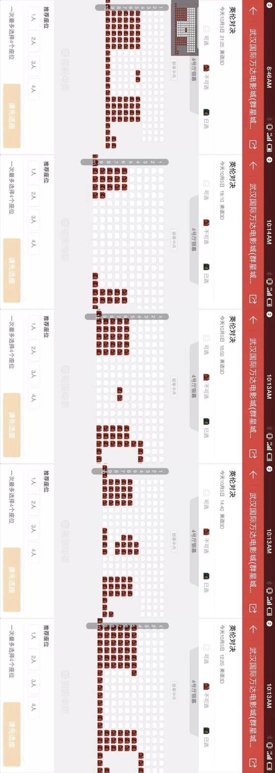 位于武昌区徐东大街的万达群星城店,从中午12:25到晚上21:25的五个场次中,我们在今日上午10点发现,这五个场次中的边缘位置呈序列状地被售出,呈现无法选择的状态,相反,中间观影视野更好的位置却无人买票观看。相同的状况在武汉万达大智路店、福客茂店这两家影院都有出现。