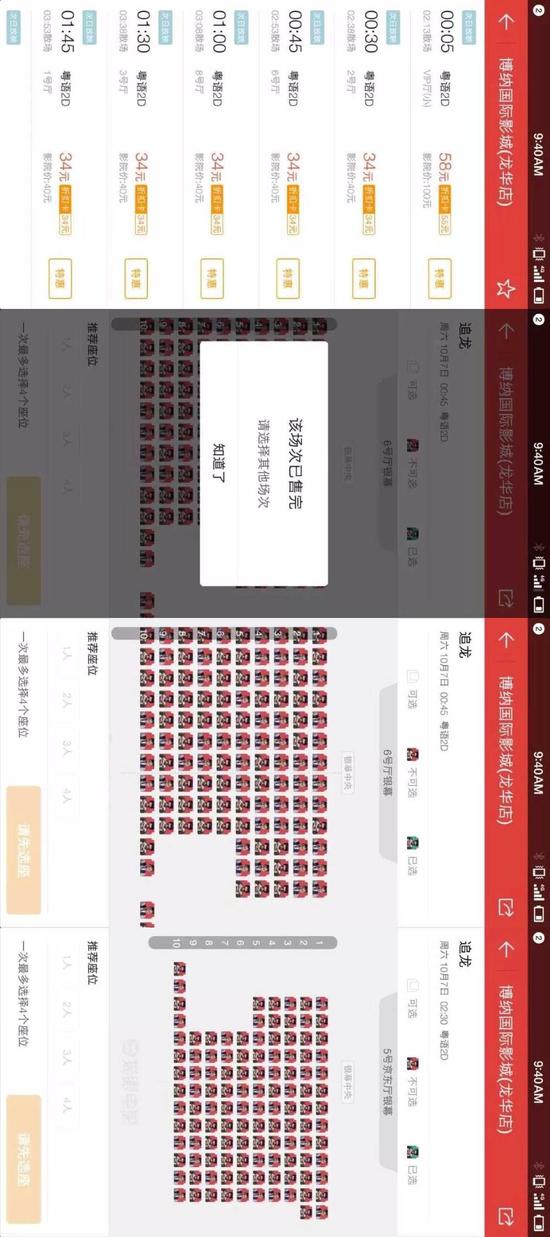 在今天查询后天凌晨的场次,这样的场次也已经满座了。另一方面,这家影城的《追龙》在白天并没呈现常常爆满的情况。也就是说,用户在下午时可以在这家影城买到晚上七八点消费黄金场的票,但买不到后天凌晨的《追龙》场次。