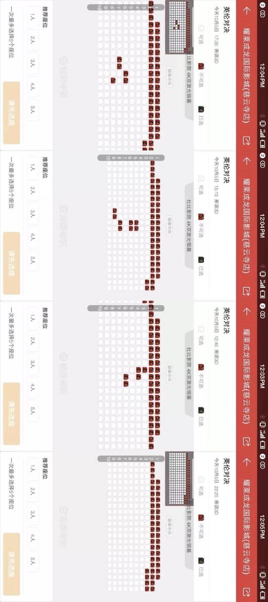 《三声》在今日中午12:05分查询了北京耀莱影城慈云寺店,发现分别在12:45、13:10、17:35、22:25这四个场次中,最前面的第一排都被无法购买,但中间位置还有空座。