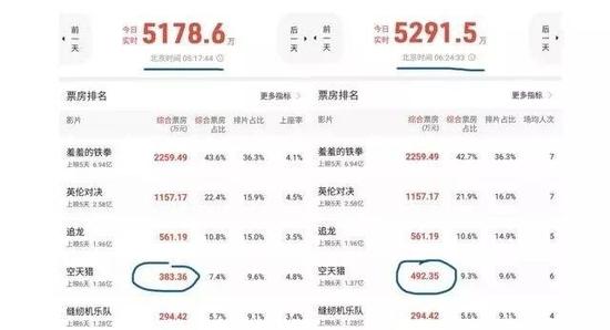 与《追龙》疑似“幽灵场”类似的是,《空天猎》也曾出现在凌晨时分票房突然规模增长的情形。