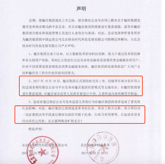 而在几天前,趣店刚因为对自媒体发表的分析文章发表了一篇措辞强硬声明,称要“立即启动一切必要的法律手段进行维权,包括但不限于民事、行政乃至刑事等,让造谣诽谤者付出应有的代价,换互联网舆论旷朗无尘”。