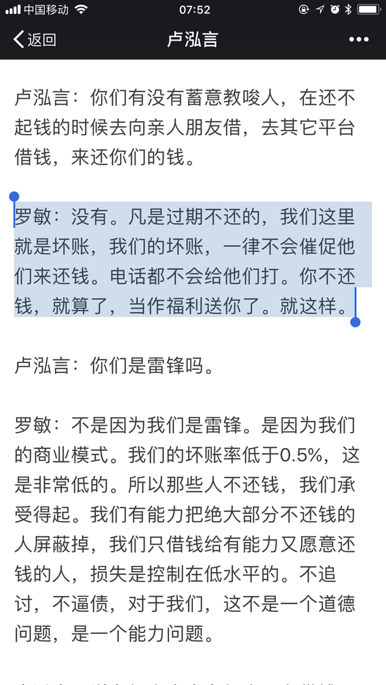罗敏:没有。凡是过期不还的,我们这里就是坏账,我们的坏账,一律不会催促他们来还钱。电话都不会给他们打。你不还钱,就算了,当作福利送你了。就这样。