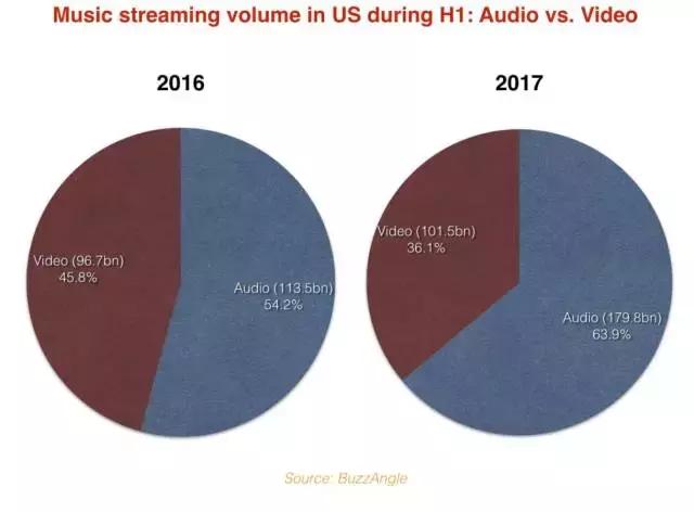 根据BuzzAngle的数据显示,2017年上半年,视频流媒体在整个流媒体份额中所占的比例被音频流媒体进一步压缩,从45.8%到了36.1%,但其总数却较2016年增长了6.1%。