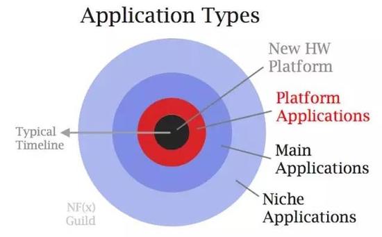 从中间的黑色圆形代表的新兴硬件平台算起,市场的发展顺序是从平台级软件应用(如微信、Facebook),发展到主要应用(手机中日常会经常使用的十多个 APP),再到细分市场(如各种垂直社区和应用等等)。