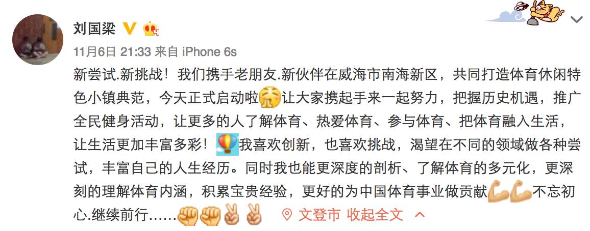 “新尝试.新挑战!我们携手老朋友.新伙伴在威海市南海新区,共同打造体育休闲特色小镇典范,今天正式启动啦!让大家携起手来一起努力,把握历史机遇,推广全民健身活动,让更多的人了解体育、热爱体育、参与体育、把体育融入生活,让生活更加丰富多彩!我喜欢创新,也喜欢挑战,渴望在不同的领域做各种尝试,丰富自己的人生经历。同时我也能更深度的剖析、了解体育的多元化,更深刻的理解体育内涵,积累宝贵经验,更好的为中国体育事业做贡献!不忘初心,继续前行……”