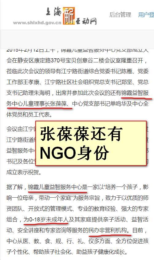 张葆葆名下有8家公司,她还是其中两家公司的法人。公司的名字都跟儿童有关,比如“上海童成”、“上海童领”等等。但是与此同时,张葆葆还有民办非政府组织的身份——上海静安区江宁社区锦霞儿童益智服务中心的理事长!