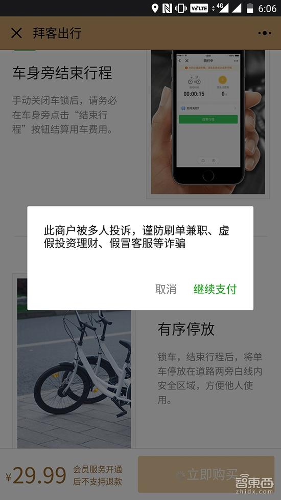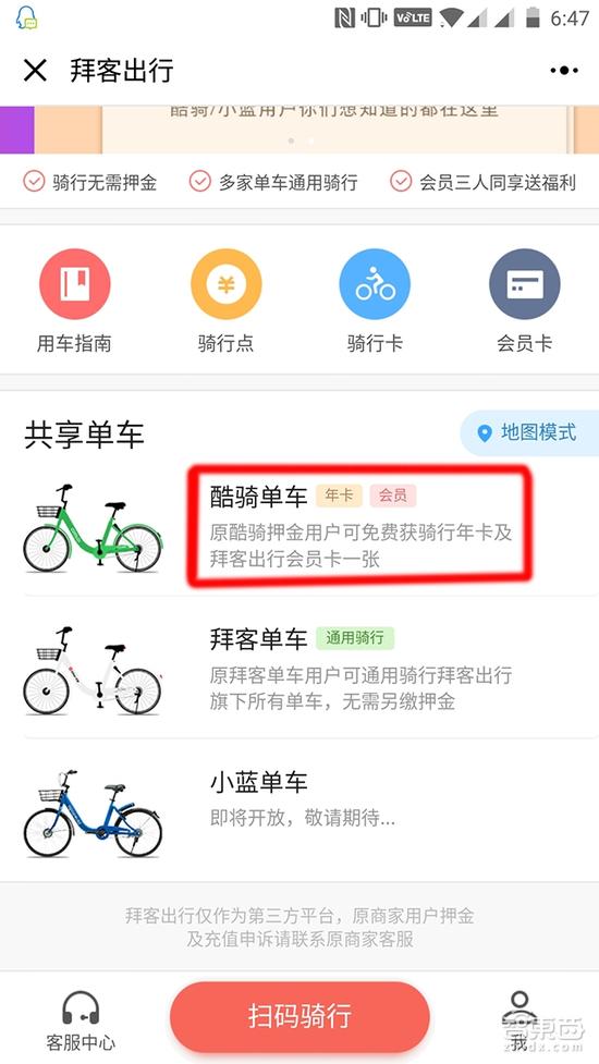 车东西记者尝试使用了其上线的微信小程序“拜客出行”。此前在酷骑缴纳了押金的用户,在新平台将获得免费骑行年卡以及会员身份(相当于押金)。非酷骑押金用户则需要花29.9元购买一个会员身份才能骑行。