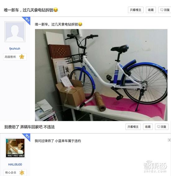 无人管理的单车成为了无主之财。为了挽回押金上的损失,已经有用户选择将小蓝单车搬回家抵债。有一部分用户发帖称,已经搬了一辆小蓝单车回家,作为其押金的抵扣;更有用户已经对小蓝单车的锁具进行了暴力拆卸,将其作为了私人车辆。