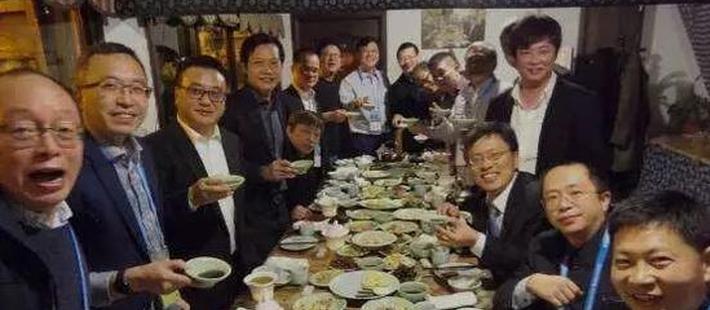 “晚上的乌镇互联网峰会。大家品尝了丁磊自己养的猪肉,螃蟹,绍兴黄酒。马化腾最能喝最能劝酒。张磊和张朝阳大谈养生之道。曹国伟揭秘他当年如何错失雅虎(杨致远)。”