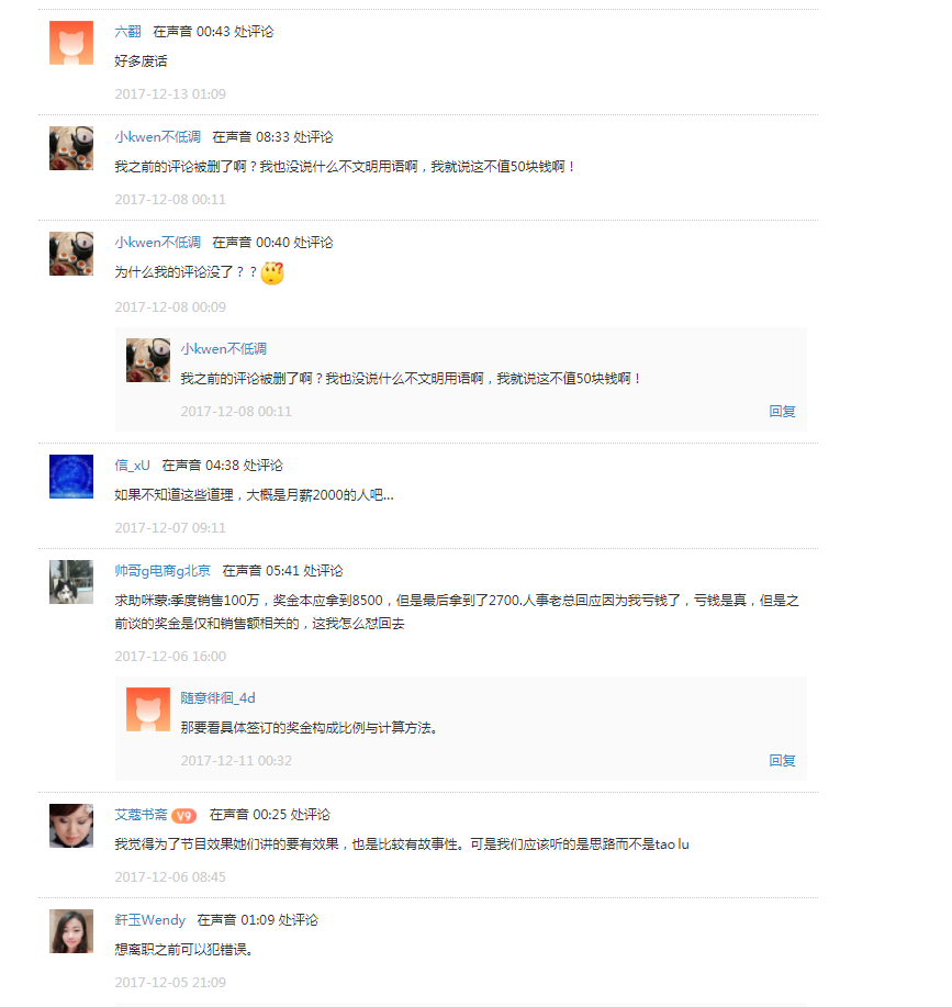 2017的下半年,也是知识付费人设崩塌事故期。8月,罗永浩宣布停更“创业课“,上面那句话,是媒体从罗永浩的停更信中读出的心声;9月,Papi酱也退出了分答社区;年底相继上线的“郭德纲首档音频脱口秀”、“咪蒙职场提升课”,反响普遍不高,甚至有用户要求退钱。