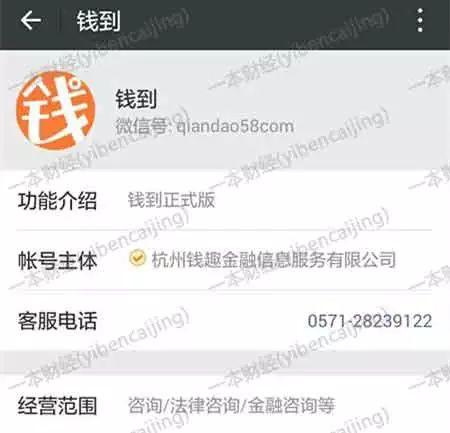 公司名牌被摘下,换成了婚庆公司李洋自称是现金贷平台“钱到”的员工,该平台有一个可申请贷款的微信公众号,账号主体显示为:杭州钱趣金融信息服务有限公司。