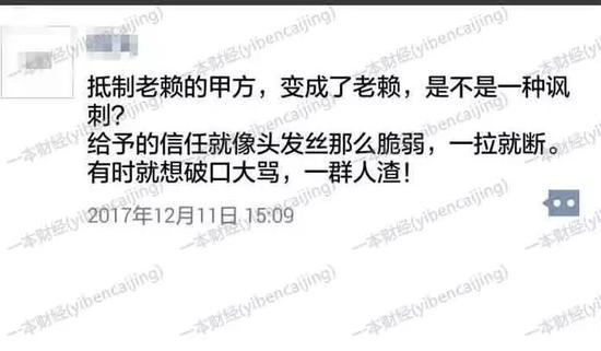 她发了一条朋友圈抱怨:“抵制老赖的甲方,变成了老赖,是不是一种讽刺?”