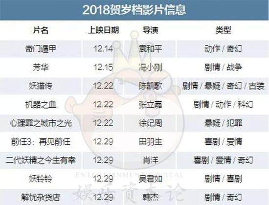 在IP之风经久不衰的如今,贺岁档内的影片也多与“IP”挂钩,如《芳华》《妖猫传》《解忧杂货店》《心理罪之城市之光》均改编自小说,《奇门遁甲》翻拍自袁和平1982年同名电影,《前任3》则是系列制作。所以谁能杀出贺岁档尚未可知,但可以断言的是,今年贺岁档已经是IP的又一次胜利了。
