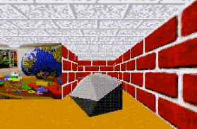 这个游戏不但能在迷宫中自由移动,还增加了跳跃、射击等特色元素。射出来的子弹击中墙壁后,默认的红砖墙会变成部分透明的花纹,可以隐约看清后方的情景。更重要的是,在这个游戏中过关后终于可以进入真正意义上的“下一关”,虽然之后的迷宫贴图依然是新版三维迷宫的内置贴图,但是论完成度上,《屏保诡计》算得上是各种土制三维迷宫游戏的集大成者了。