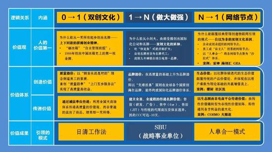 传递价值也是这样,先通过诚信单位的传递,然后再可以转换自己建立全员全流程体系。然后到现在,才能变成生态圈系统,而不是靠电商。引领模式也是从日清工作法来延伸,没有日清不会有SBU,没有SBU也不可能有“人单合一”。这是横向的,纵向也一样。