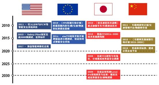 一份公开的报告显示,全球车联网发展的历程中,各国的研发节奏几乎相同。从车联网概念诞生的2010年开始,各国都着重于技术方面的研发,并将在2020年前后形成统一的车联网行业标准。