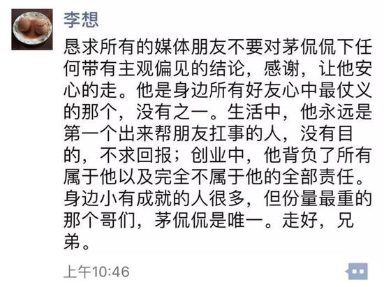 茅侃侃写过一本书,叫《像恋爱一样去工作》,他留下的最后一条朋友圈说“爱你我不后悔,但我尊重故事的结尾”。