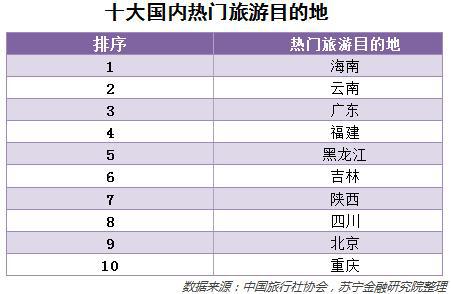 从2018年国内十大热门旅游目的地来看,过年南下或者北上是春节的首选。南下的话,海南、云南、广东、福建排名前四,空气质量好、天气暖和是这些省份的优势;黑龙江和吉林分别排名第五和第六,因为寒冬大雪、暖气土炕对部分南方人来说有一定的吸引力(参见下表)。