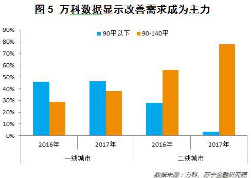 改善需求是本轮房地产周期的核心推动力量。房子变大了,自然会配套更好的家电、家具和汽车。根据万科的销售数据,一线城市中90-140平米的改善需求占比从2016年的29%提升到2017年的38%,二线城市改善需求占比从2016年的56%提升至2017年的78%(参见图5)。