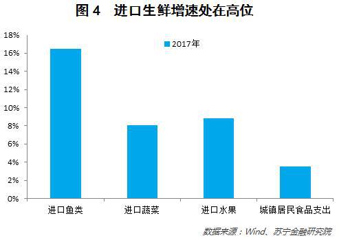 从数据上看,2017年不论是进口的鱼类、还是进口的蔬菜和水果,其增速都要明显高于城镇居民的食品支出增速,说明大家现在追求的是吃的好,而不再是吃的饱(参见图4)。