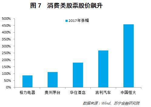这一轮房地产周期也充分反应在了资本市场中。不论是购置大房子、春节买高端白酒,还是更换家电、购买汽车、外出旅游住星级酒店,消费升级既与日常生活紧密相关,也反映在相关股票的股价之中。地产、白酒、家电、汽车、酒店相关股票在2017年都有80%至460%的涨幅(参见图7)。