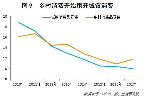 其次,农村消费增速开始超过城镇。从社会消费品零售总额增速看,2017年乡村消费品零售增速开始甩开城镇消费品增速——2017年乡村消费品增速反弹至11.8%,但城镇消费品增速下滑至10.0%(参见图9)。