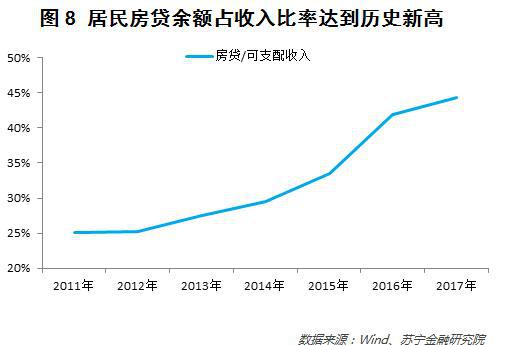 从居民房贷余额与可支配收入的对比来看,2017年居民的房贷余额占可支配收入的比例上升到了历史最高位——从2013年的27%提升至2017年的44%(参见图8)。可以想象,当房价的潮水退去,只剩下一群还着巨额房贷的人在裸泳。