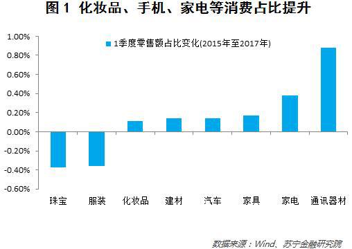 观察每年1季度的零售额占比变化,可以发现年货消费结构变迁——近三年来,服装、金银珠宝首饰消费占比稳步下降,但化妆品、手机、家电、家具和汽车占比不断攀升(参见图1)。通俗点说,人们已经不再满足过年穿新衣、戴新首饰,渐渐地开始在新年置办心仪物件,让自己和生活变得更有质感。