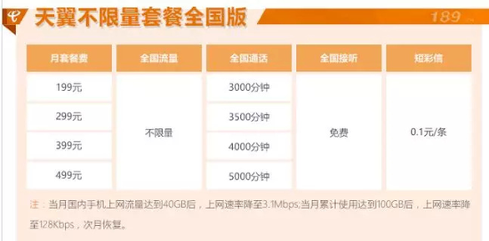 北京电信“天翼不限量”套餐全国版: