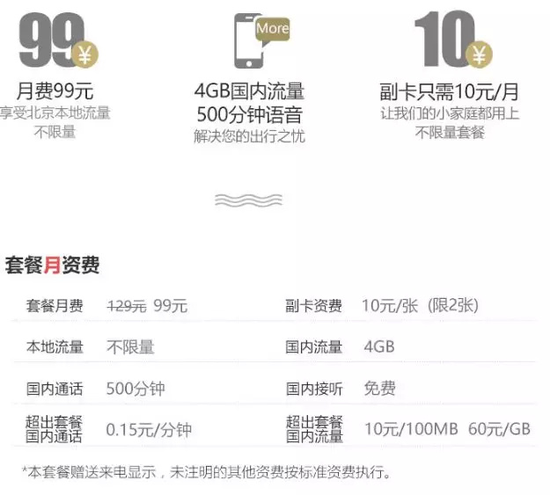199元可以全国不限量+3000分钟语音,99元可以北京不限量+3GB全国流量+500分钟语音。在全国跑的用户可以选199元的全国版,主要在北京活动的用户可以选北京版。