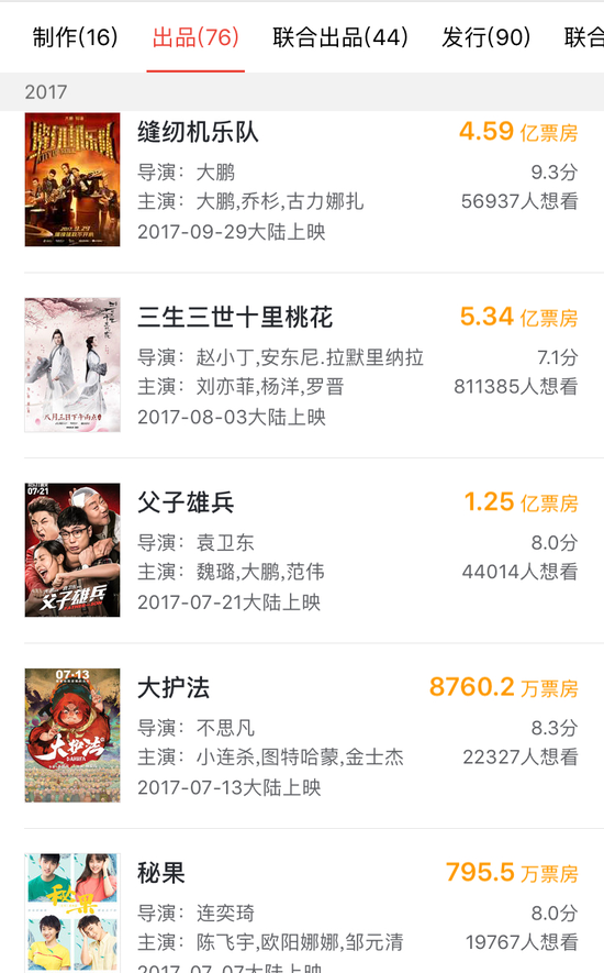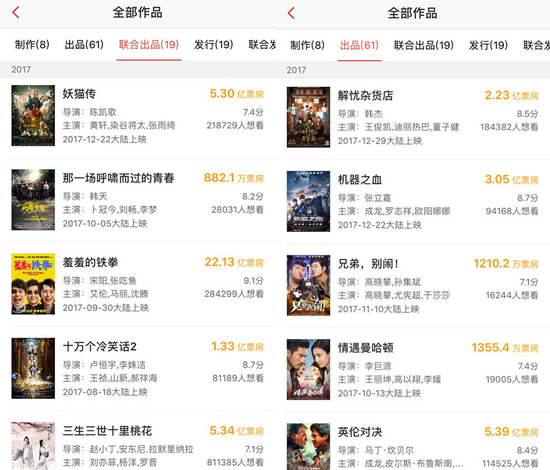 猫眼数据显示,2017年万达参与出品发行的电影达到26部,累计总票房近144亿,是五大影视巨头中电影出品数量最多的公司。电影名单中包括2017年春节档冠军《西游伏妖篇》(票房达到16.52亿)和年度最大两匹黑马《战狼2》(票房达到56.82亿)与《羞羞的铁拳》(票房达到22.13亿),但这些电影背后资方基本达到20家,万达都并非担任主要出品方。