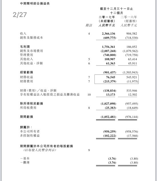 近日(2月27日)阿里影业发布了2017年全年业绩报告,报告显示,阿里影业2017年的收入为23.66亿元,2016年年收入为9.04亿,同比增长162%。报告期内毛利润为17.56亿元,2016年1则为1.86亿元,同比上涨844%;2017年净亏损为9.50亿元,较2016年的9.58亿元同比下降0.87%。三大业务中影业内容制作和综合开发业务实现扭亏为盈,但整体依旧处在亏损状态。