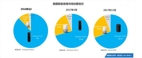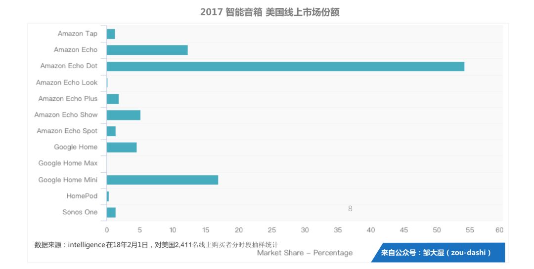 我们在之前文章中,公布了两组组数据。一个是美国亚马逊Echo和Google home的的市场份额。第二个是细分品类的份额。之前我们提到了,Echo show在2017年数据很耀眼,是亚马逊Echo阵营的第三势力。
