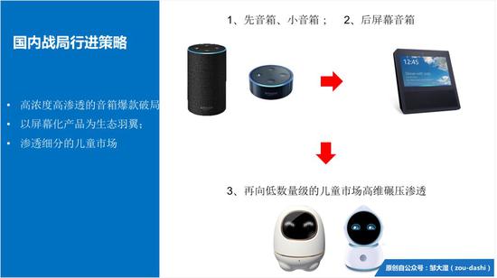其次,国内的儿童市场,很明显差异于欧美市场。亚马逊和谷歌是到2017年,才开始做儿童的技能。但早在智能音箱在美国兴起的2016年,国内语音技术,就以智能早教机的形态,向国内家庭渗透。国内的儿童机器人,就是儿童版的智能音箱。这是一个看得到,摸得清、需求可见的细分市场。小爱同学与其选一个不沾边的二次元形态,还不如选一个儿童喜欢的形象IP。 智能音箱从大众用户向细分用户渗透,是全局生态战的必然演化。