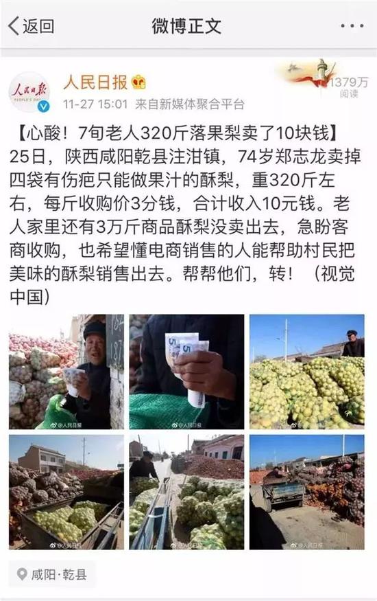 人民日报官方微博上曾发表了一条标题为《辛酸!7旬老人320斤落果梨卖了10块钱》的微博,陕西乾县74岁果农郑爷爷“320斤落果酥梨只卖了10块钱”,令人心痛。虽然卖出了300多斤梨,但是他们家还有3万斤,而这些酥梨只是村里大量销路困难酥梨中的极少部分。这些从唐朝开始就作为“贡梨”进献的果子,如今像秤砣一样沉沉地压在果农心上。郑爷爷重病在身,老伴也沧桑干瘦,拼多多线上店铺负责人当即表示将郑爷爷家的1万5千斤梨全数收购。