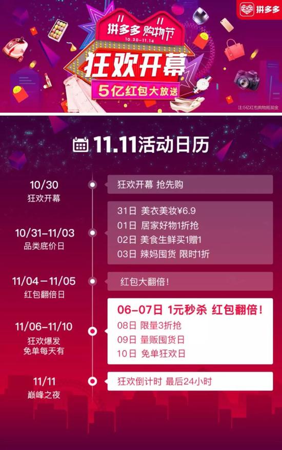 这一阶段一连串的事件均成为拼多多腾飞的推力,比如10月周年庆;11月双11日全民狂欢节;12月双12狂欢节;年底清仓;年初撒钱等等。
