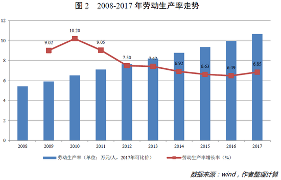 那么,今天的人工智能,是否会重复昨天IT生产率悖论的故事?我们不妨从数据总寻找答案。从图2来看,自2008年国际金融危机至今,中国的劳动生产率水平一直是稳步上升的,但增速却从2009年的9.02%降至2017年的6.85%,虽说个别年份增速有所波动,但依旧无法掩盖总体下降的态势。