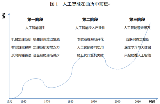 不过,人工智能的发展实践却不是一帆风顺。一个甲子的轮回中,人工智能的发展经历了三起三落,但总的趋势依旧是稳步向前(详见图1)。