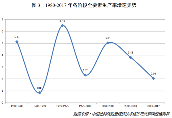 另外,为了便于观察,笔者采取大致五年一个阶段来衡量全要素生产率的平均增速水平。从图3中不难看出,自2000年以来,中国的全要素生产率增速是逐阶段趋于下降的,尽管近年来各种新技术、新产业、新业态、新模式喷薄涌现,但是2010-2017年全要素生产率的平均增速却降至1990年以来的最低值,仅为2.04%。