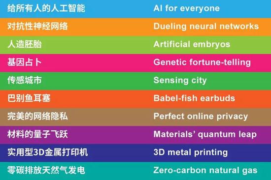 2018 年《麻省理工科技评论》全球十大突破性技术榜单包括:给所有人的人工智能(云端 AI)、对抗性神经网络、人造胚胎、“基因占卜”、传感城市、巴别鱼耳塞、完美的网络隐私、材料的量子飞跃、实用型 3D 金属打印机、零碳排放天然气发电共 10 大突破性技术。