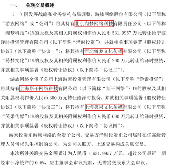 这是游族网络昨晚的一份关联交易公告的高度概括。在昨晚的公告里,游族网络因发展战略和业务结构布局调整,将其持有的淘梦科技、筑梦文化、斯干网络和笑果文化四家公司股权出售,披露了一些让外界相当震惊的资料。