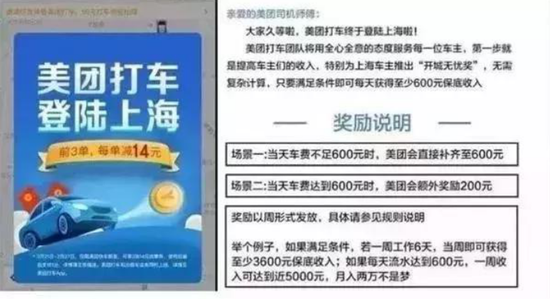 在司机端上,目前美团采取的主要措施是对司机的跑单收入进行补贴,不足600元的直接补贴600元,超过600的额外奖励200元,反正就是让司机每天用美团打车而不是用滴滴,这对一些还没有在滴滴上摸准门道,形成收入正循环的师傅还是有一定诱惑的。这也就造成了在司乘两端的补贴之后,美团打车每个订单的亏损在30元到40元。