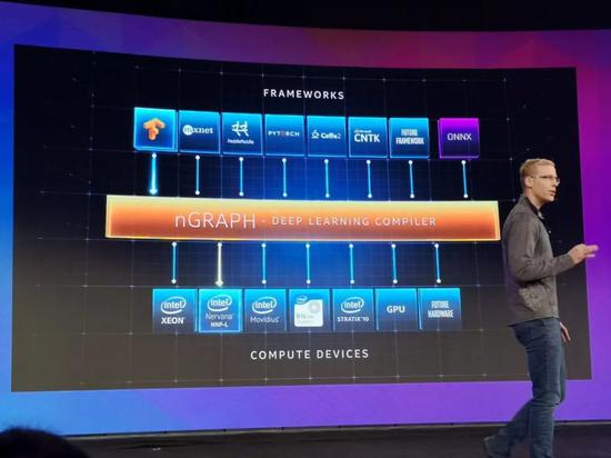 英特尔AI软件总负责人Jason Knight推出了英特尔nGRAPH平台,这是一个开源深度学习平台,能够支持目前主流开源框架如TensorFlow、CNTK、Caffe2等,还能支持英特尔所有硬件,让开发者在同一个平台上自由选用AI软件算法框架与英特尔硬件,从理论上运行类似英伟达的TensorRT。